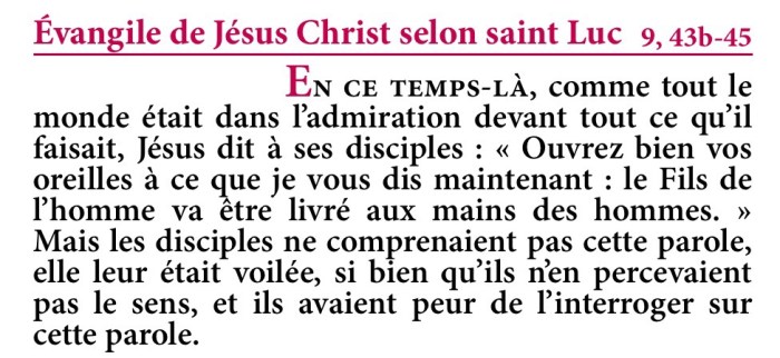 Mais les disciples ne comprenaient pas cette parole, elle leur était voilée, si bien qu’ils n’en percevaient pas le sens, et ils avaient peur de l’interroger sur cette parole.