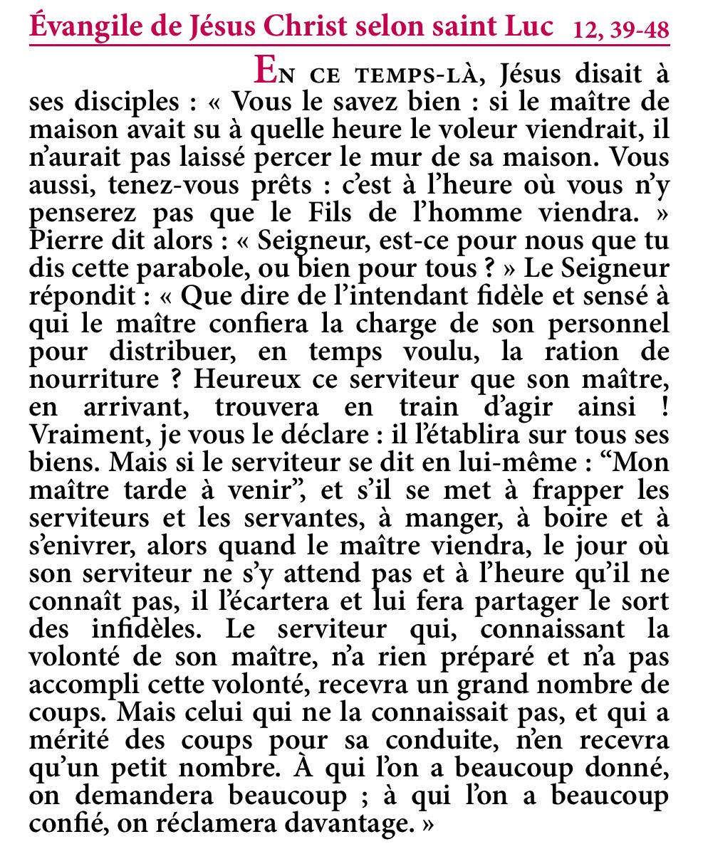 Évangile de Jésus-Christ selon saint Luc 12,39-48.