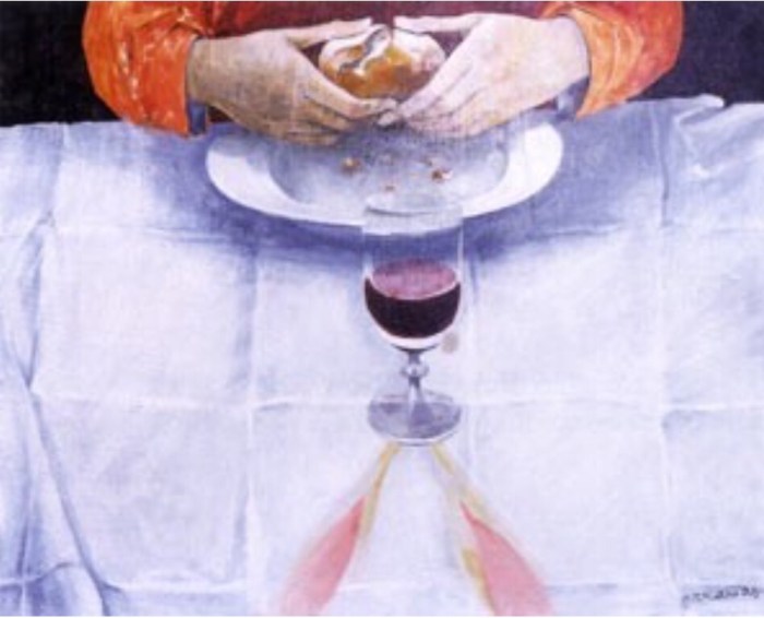 Et ce verre, posé au centre de la toile, élève à son tour notre regard vers le pain.