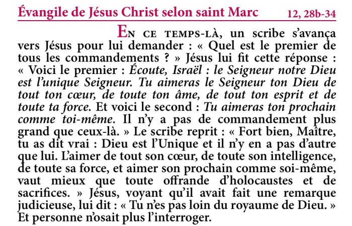 L’aimer de tout son cœur, de toute son intelligence, de toute sa force, et aimer son prochain comme soi-même, vaut mieux que toute offrande d’holocaustes et de sacrifices. »