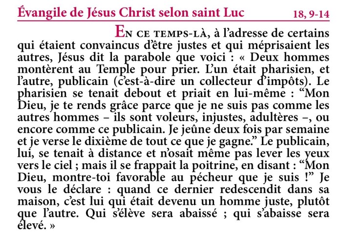 Le pharisien se tenait debout et priait en lui-même : ‘Mon Dieu, je te rends grâce parce que je ne suis pas comme les autres hommes – ils sont voleurs, injustes, adultères –, ou encore comme ce publicain.