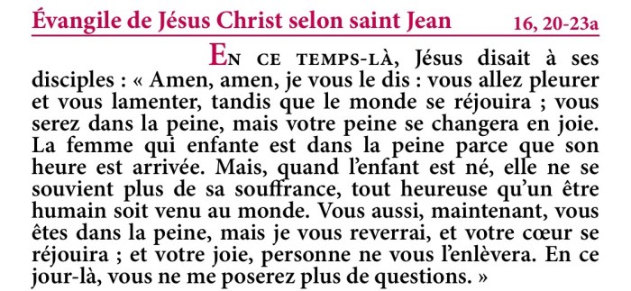En ce temps-là, Jésus disait à ses disciples : « Amen, amen, je vous le dis : vous allez pleurer et vous lamenter, tandis que le monde se réjouira ; vous serez dans la peine, mais votre peine se changera en joie.