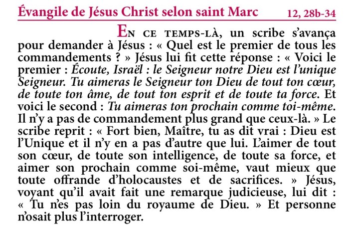 L’aimer de tout son cœur, de toute son intelligence, de toute sa force, et aimer son prochain comme soi-même, vaut mieux que toute offrande d’holocaustes et de sacrifices. »