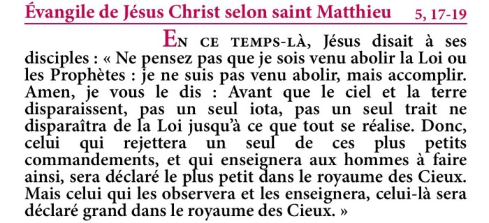 Amen, je vous le dis : Avant que le ciel et la terre disparaissent, pas un seul iota, pas un seul trait ne disparaîtra de la Loi jusqu’à ce que tout se réalise.