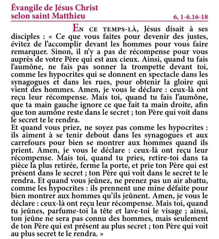 Évangile de Jésus-Christ selon saint Matthieu 6,1-6.16-18.