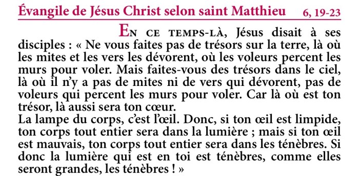Évangile de Jésus-Christ selon saint Matthieu 6,19-23.