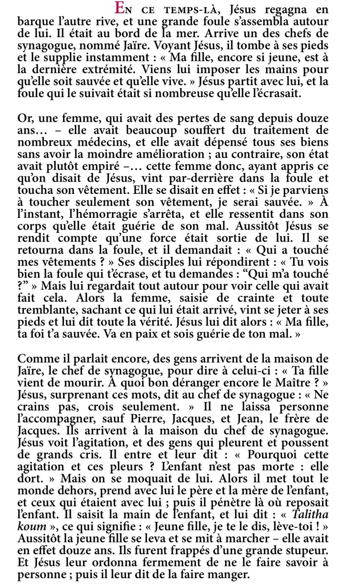 Evangile du 13ème dimanche du temps ordinaire – Année B – Extrait de la Traduction Liturgique de la Bible – © AELF, Paris