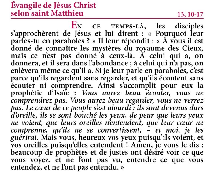 Si je leur parle en paraboles, c’est parce qu’ils regardent sans regarder, et qu’ils écoutent sans écouter ni comprendre.