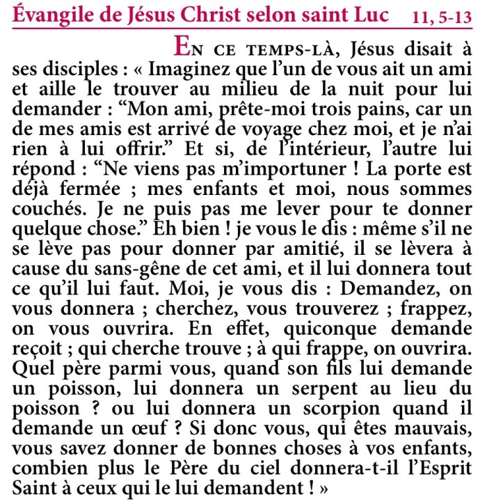 En ce temps-là, Jésus disait à ses disciples : « Imaginez que l’un de vous ait un ami et aille le trouver au milieu de la nuit pour lui demander : “Mon ami, prête-moi trois pains,