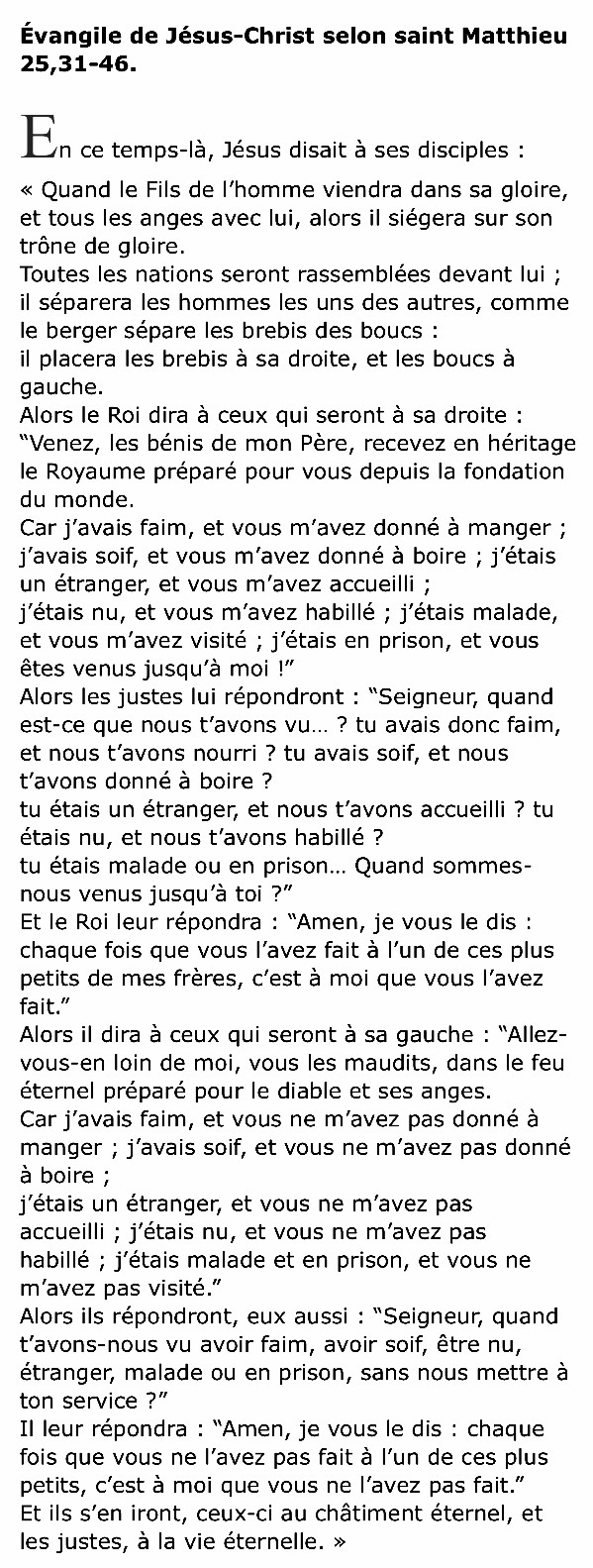Évangile de Jésus-Christ selon saint Matthieu 25,31-46.