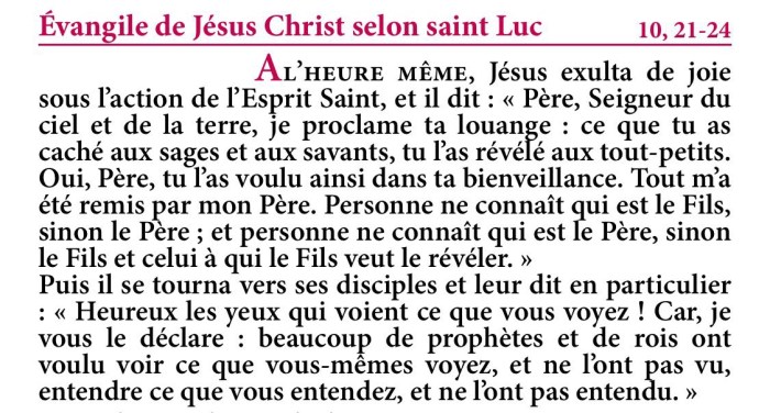 À l’heure même, Jésus exulta de joie sous l’action de l’Esprit Saint, et il dit : « Père, Seigneur du ciel et de la terre, je proclame ta louange : ce que tu as caché aux sages et aux savants, tu l’as révélé aux tout-petits. Oui, Père, tu l’as voulu ainsi dans ta bienveillance.