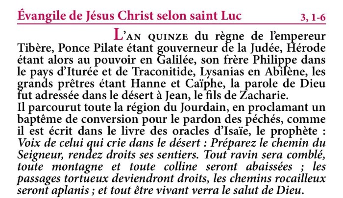 L’an quinze du règne de l’empereur Tibère, Ponce Pilate étant gouverneur de la Judée, Hérode étant alors au pouvoir en Galilée, son frère Philippe dans le pays d’Iturée et de Traconitide, Lysanias en Abilène, les grands prêtres étant Hanne et Caïphe, la parole de Dieu fut adressée dans le désert à Jean, le fils de Zacharie.