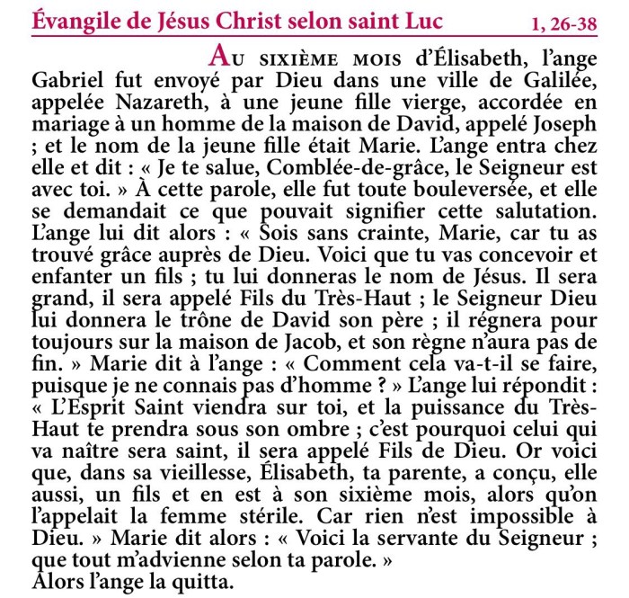 L’ange lui dit alors : « Sois sans crainte, Marie, car tu as trouvé grâce auprès de Dieu.