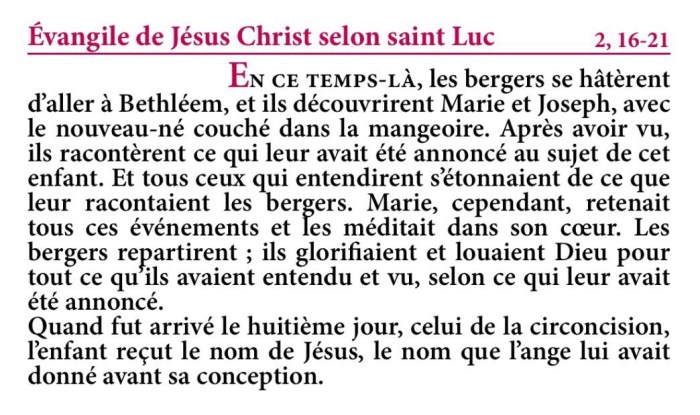 Evangile de la Solennité de Marie Mère de Dieu – Extrait de la Traduction Liturgique de la Bible – © AELF, Paris