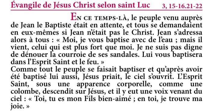 Evangile du Dimanche – Fête du Baptême de Notre Seigneur – Extrait de la Traduction Liturgique de la Bible – © AELF, Paris