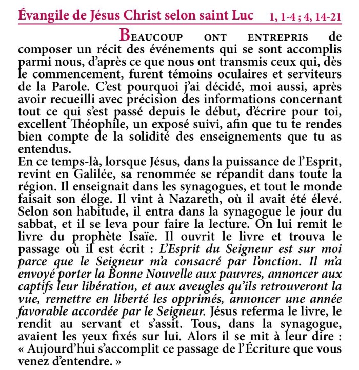 Evangile du 3ème Dimanche du Temps ordinaire – Année C – Extrait de la Traduction Liturgique de la Bible – © AELF, Paris