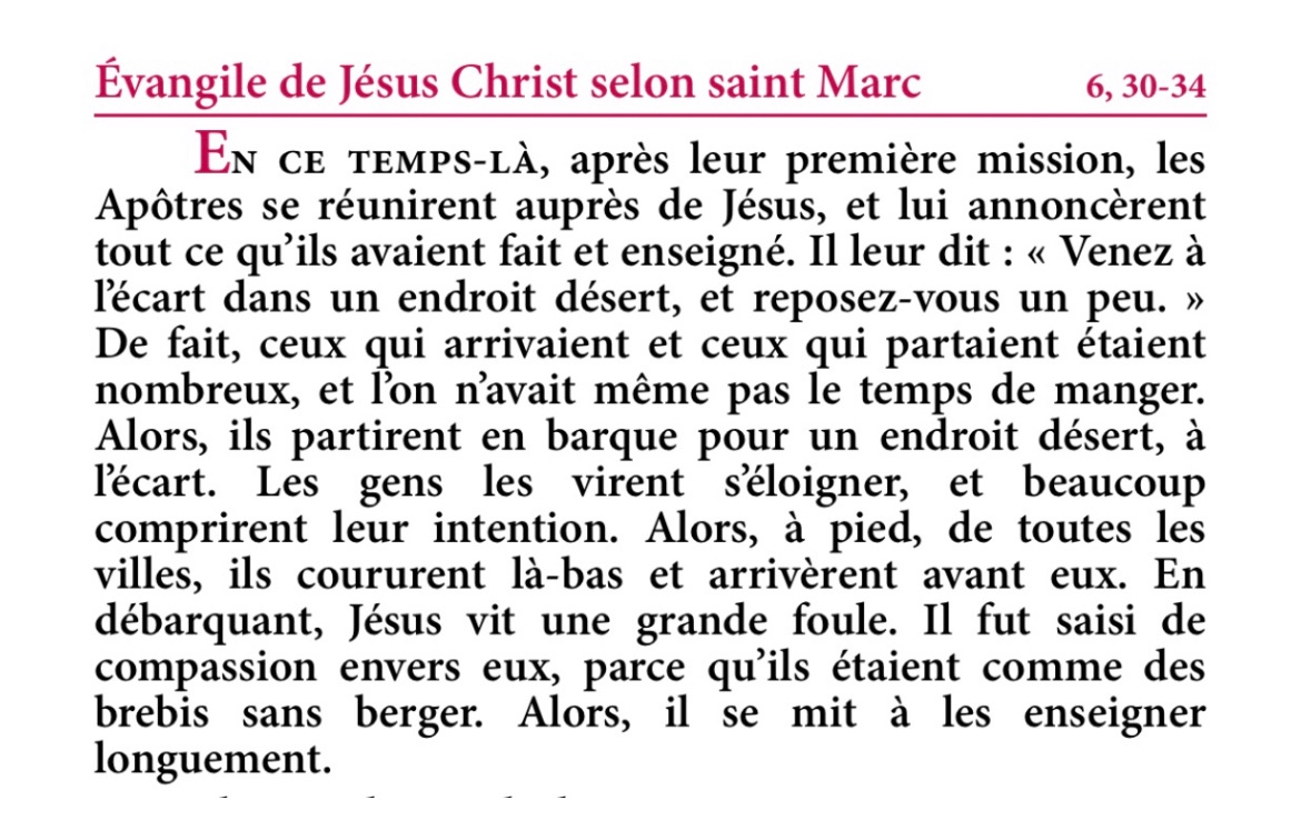 Il leur dit : « Venez à l’écart dans un endroit désert, et reposez-vous un peu. » De fait, ceux qui arrivaient et ceux qui partaient étaient nombreux, et l’on n’avait même pas le temps de manger.