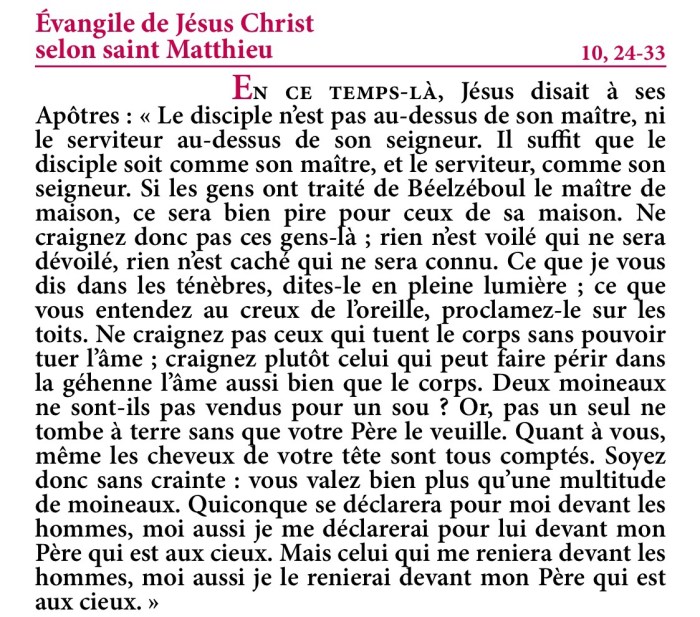 Évangile de Jésus-Christ selon saint Matthieu 10,24-33.