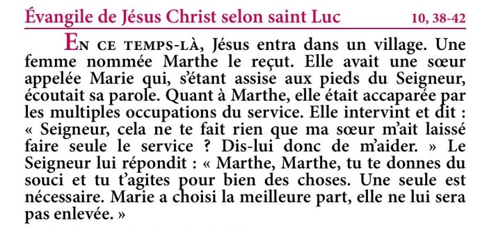 « Marthe, Marthe, tu te donnes du souci et tu t’agites pour bien des choses. Une seule est nécessaire. »