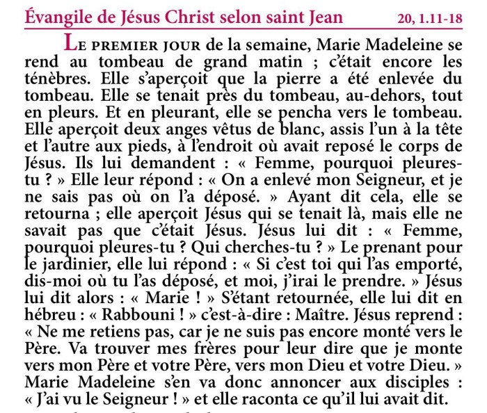 Evangile de la Fête de Marie Madeleine – disciple du Seigneur – Extrait de la Traduction Liturgique de la Bible – © AELF, Paris