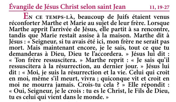 Jésus lui dit : « Moi, je suis la résurrection et la vie. Celui qui croit en moi, même s’il meurt, vivra ; quiconque vit et croit en moi ne mourra jamais. Crois-tu cela ? »
