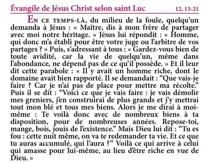 Mais Dieu lui dit : “Tu es fou : cette nuit même, on va te redemander ta vie. Et ce que tu auras accumulé, qui l’aura ?”