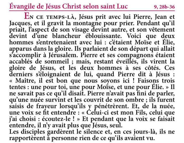 Evangile de la fête de la Transfiguration – Extrait de la Traduction Liturgique de la Bible – © AELF, Paris