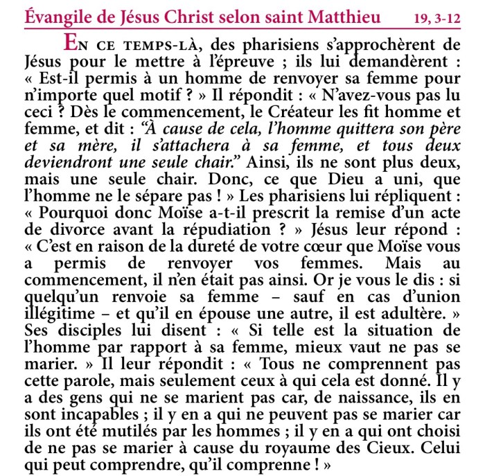 Évangile de Jésus-Christ selon saint Matthieu 19,3-12.