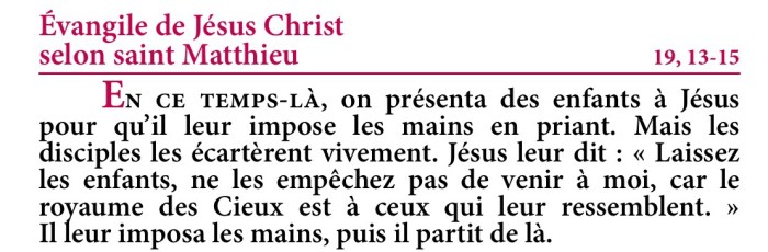 Jésus leur dit : « Laissez les enfants, ne les empêchez pas de venir à moi, car le royaume des Cieux est à ceux qui leur ressemblent. »