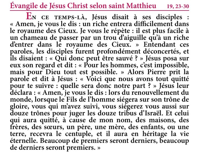 En ce temps-là, Jésus dit à ses disciples : « Amen, je vous le dis : un riche entrera difficilement dans le royaume des Cieux.