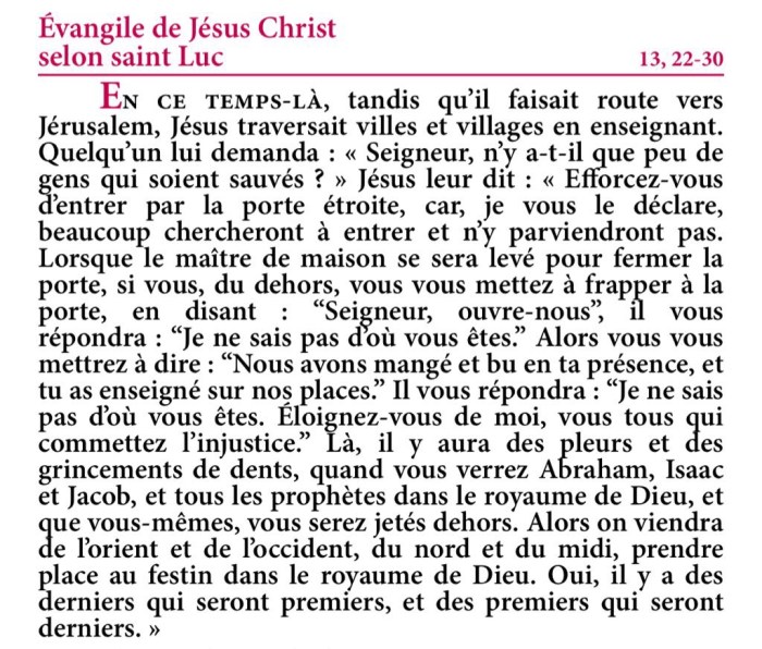 Quelqu’un lui demanda : « Seigneur, n’y a-t-il que peu de gens qui soient sauvés ? » Jésus leur dit :