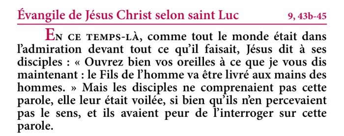Mais les disciples ne comprenaient pas cette parole, elle leur était voilée, si bien qu’ils n’en percevaient pas le sens, et ils avaient peur de l’interroger sur cette parole.
