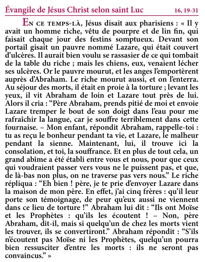 Evangile du 26ème dimanche du temps ordinaire – annee C – Extrait de la Traduction Liturgique de la Bible – © AELF, Paris
