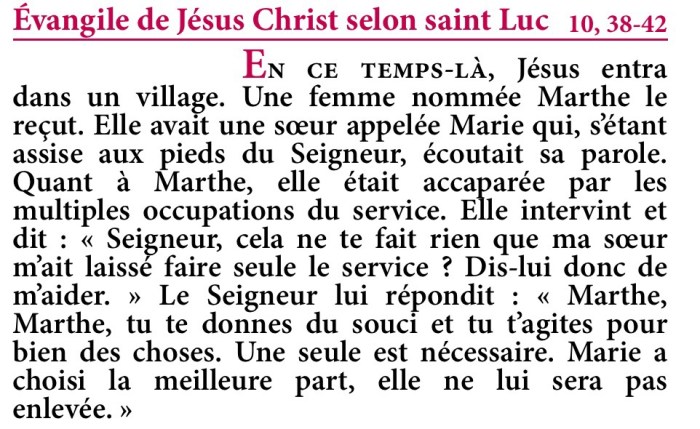 Une seule est nécessaire. Marie a choisi la meilleure part, elle ne lui sera pas enlevée. »