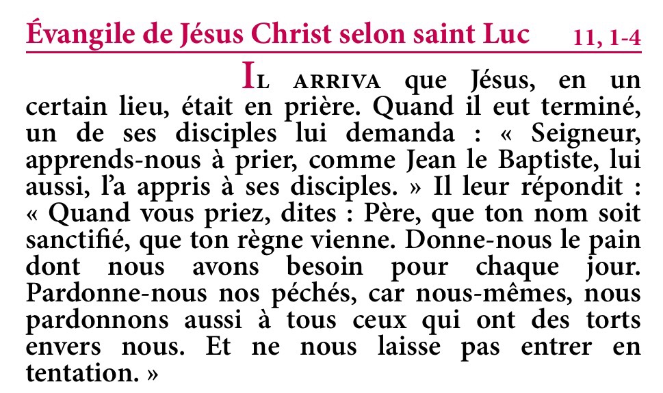 Il arriva que Jésus, en un certain lieu, était en prière. Quand il eut terminé, un de ses disciples lui demanda : « Seigneur, apprends-nous à prier, comme Jean le Baptiste, lui aussi, l’a appris à ses disciples. »