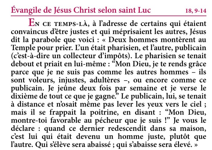 Le pharisien se tenait debout et priait en lui-même : ‘Mon Dieu, je te rends grâce parce que je ne suis pas comme les autres hommes – ils sont voleurs, injustes, adultères –, ou encore comme ce publicain.
