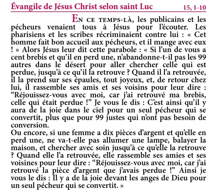 « Si l’un de vous a cent brebis et qu’il en perd une, n’abandonne-t-il pas les quatre-vingt-dix-neuf autres dans le désert pour aller chercher celle qui est perdue, jusqu’à ce qu’il la retrouve ?