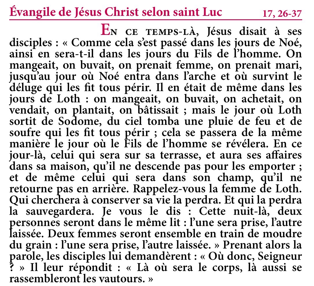Évangile de Jésus-Christ selon saint Luc 17,26-37.