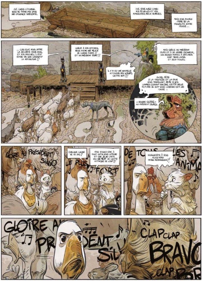 Xavier Dorison s’inspire, en le revisitant, du célèbre roman d’Orwell « la Ferme des animaux », pour camper un immense château aussi imposant que son taureau tyran. Son scénario est magnifié par le dessin d’un jeune auteur de 26 ans qui signe avec cet album sa première bande dessinée, Félix Delep.