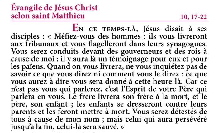 Évangile de Jésus-Christ selon saint Matthieu 10,17-22.