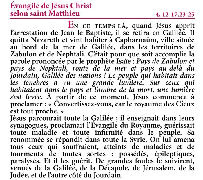 Évangile de Jésus-Christ selon saint Matthieu 4,12-17.23-25.