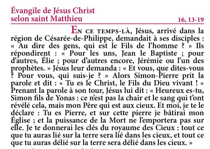 Evangile de la fête de la Chaire de Saint Pierre – Extrait de la Traduction Liturgique de la Bible – © AELF, Paris