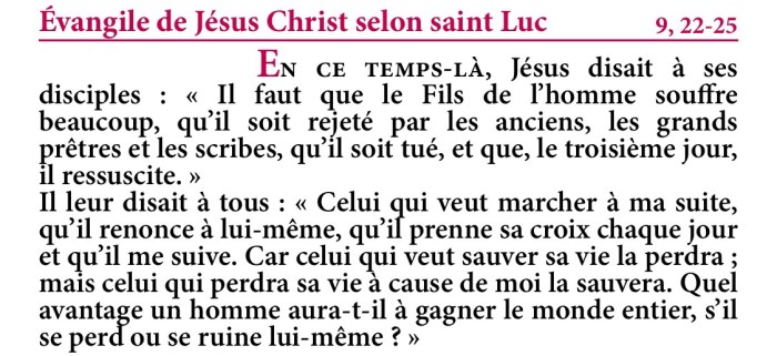 Il leur disait à tous : « Celui qui veut marcher à ma suite, qu’il renonce à lui-même, qu’il prenne sa croix chaque jour et qu’il me suive.