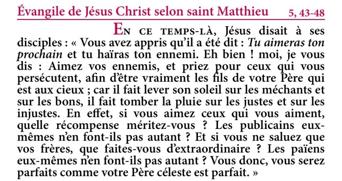 Eh bien ! moi, je vous dis : Aimez vos ennemis, et priez pour ceux qui vous persécutent, afin d’être vraiment les fils de votre Père qui est aux cieux ; car il fait lever son soleil sur les méchants et sur les bons, il fait tomber la pluie sur les justes et sur les injustes.
