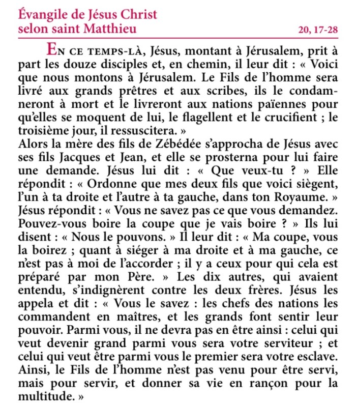 Évangile de Jésus-Christ selon saint Matthieu 20,17-28.
