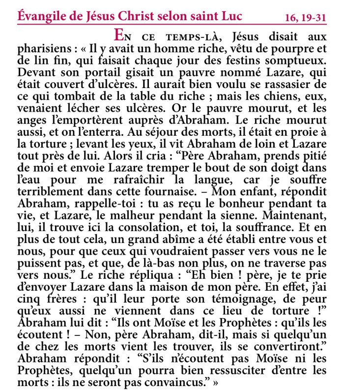 Terrible et formidable parabole : si la misère de Lazare n’a rien changé dans le coeur du riche, quelqu’un pourrait bien ressusciter des morts le coeur du riche n’en serait pas plus changé. Formidable et terrible parabole !