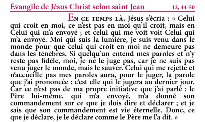 En ce temps-là, Jésus s’écria : « Celui qui croit en moi, ce n’est pas en moi qu’il croit, mais en Celui qui m’a envoyé ; et celui qui me voit voit Celui qui m’a envoyé.