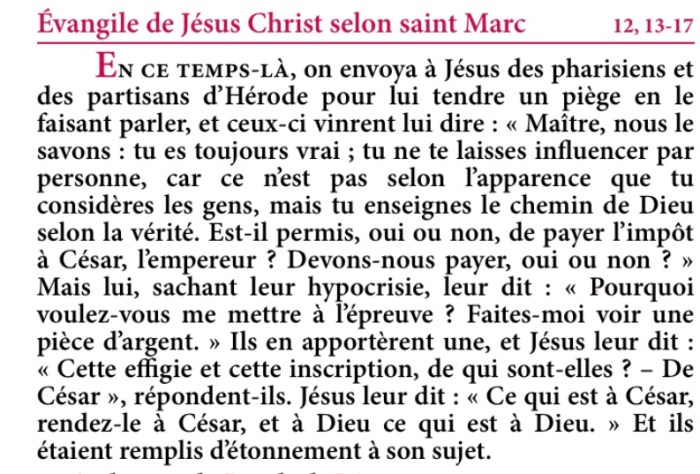 « Jésus leur dit : ‘Ce qui est à César, rendez-le à César, et à Dieu ce qui est à Dieu.' » Mc 12
