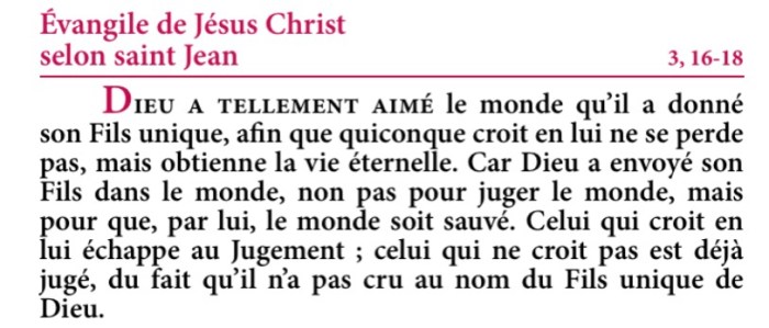 En ce temps-là, Jésus disait à Nicodème : « Dieu a tellement aimé le monde qu’il a donné son Fils unique, afin que quiconque croit en lui ne se perde pas, mais obtienne la vie éternelle.