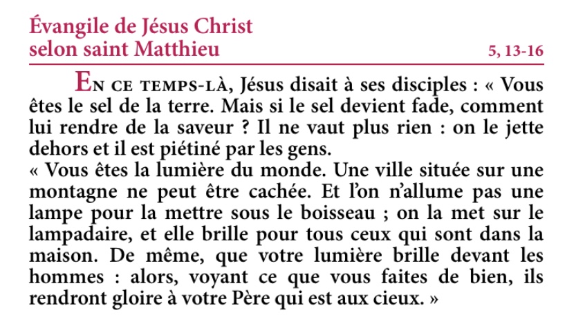 En ce temps-là, Jésus disait à ses disciples : « Vous êtes le sel de la terre. Mais si le sel devient fade, comment lui rendre de la saveur ? Il ne vaut plus rien : on le jette dehors et il est piétiné par les gens. Vous êtes la lumière du monde. Une ville située sur une montagne ne peut être cachée. Et l’on n’allume pas une lampe pour la mettre sous le boisseau ; on la met sur le lampadaire, et elle brille pour tous ceux qui sont dans la maison. De même, que votre lumière brille devant les hommes : alors, voyant ce que vous faites de bien, ils rendront gloire à votre Père qui est aux cieux. »